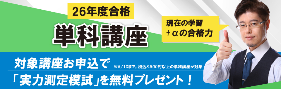 | 備考 | ・本講座は、25年度合格版森T講座と単科講座でご提供しました「2025記述式攻略講義」と同じ内容です。また添削はございません ・本講座は「法令択一クエスト」はつきませんのでご注意ください ・本講座は質問機能、フォローアップはございません。また合格お祝い金対象外です ・26年度合格版森T講座受講生の方は、50%オフのクーポンをご利用いただけます。詳しくは割引ページ内「森T講座受講生 単科割引」をご確認ください |