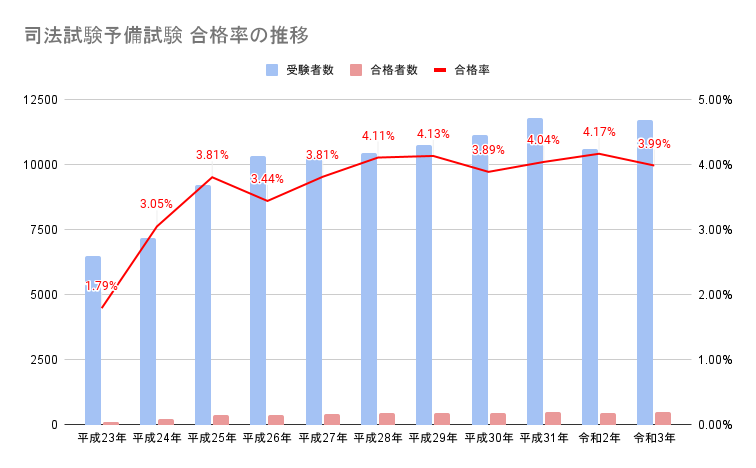 この表から分かるように、予備試験の合格率は4%前後を推移しており、合格率は非常に低く、難易度の高い試験といえます。
